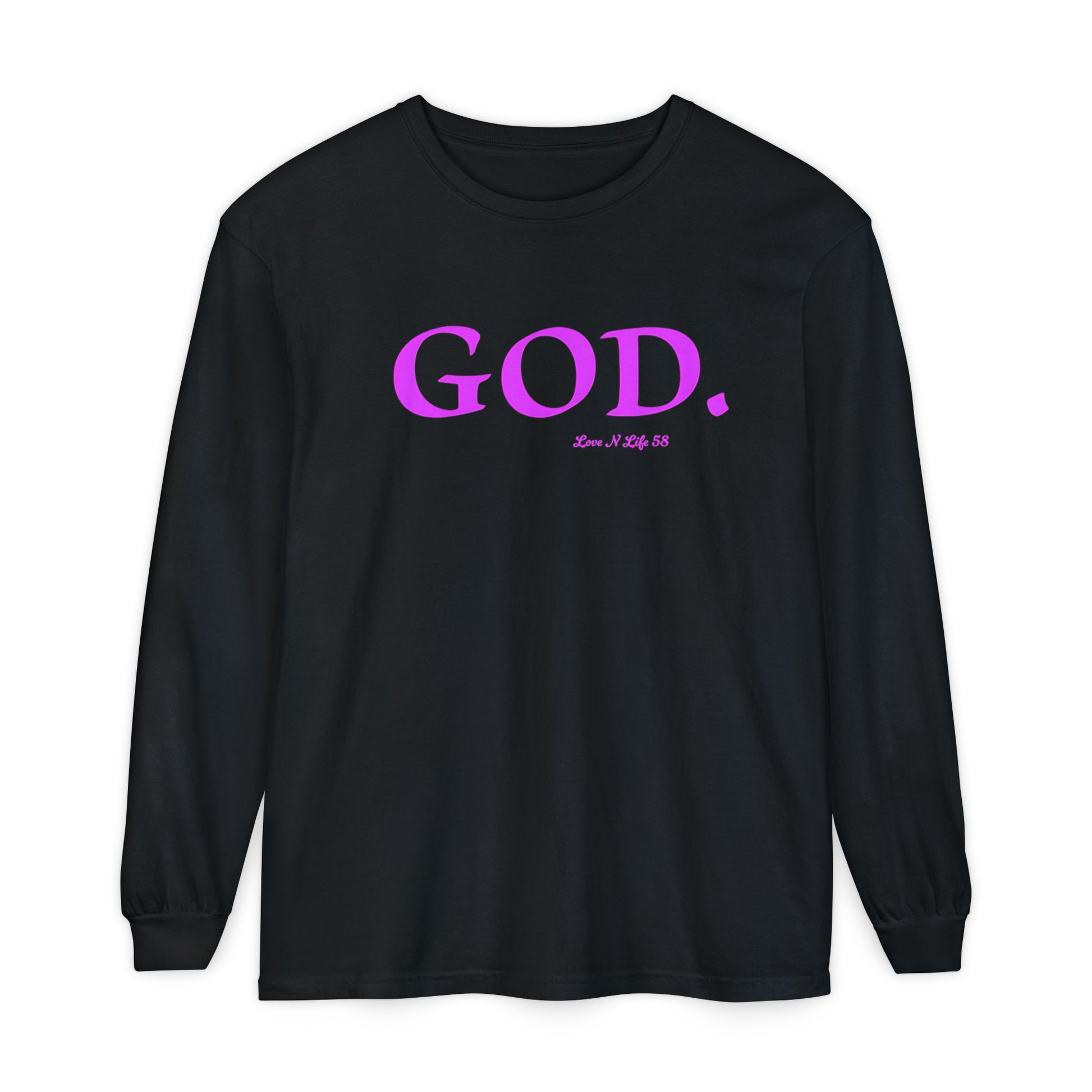 Description: Comfort Colors Tee - A soft, garment-dyed long sleeve that speaks quietly but confidently. Clean white cotton with a bold, magenta "GOD." across the chest—minimalist and reverent. The medium-weight ring-spun fabric drapes gently, the ribbed cuffs and classic fit keep the silhouette relaxed and familiar. Wear it to morning coffee, late-night worship, community gatherings, or afternoons of quiet reflection. It settles into your rotation like a trusted verse: simple, steady, and unmistakable.