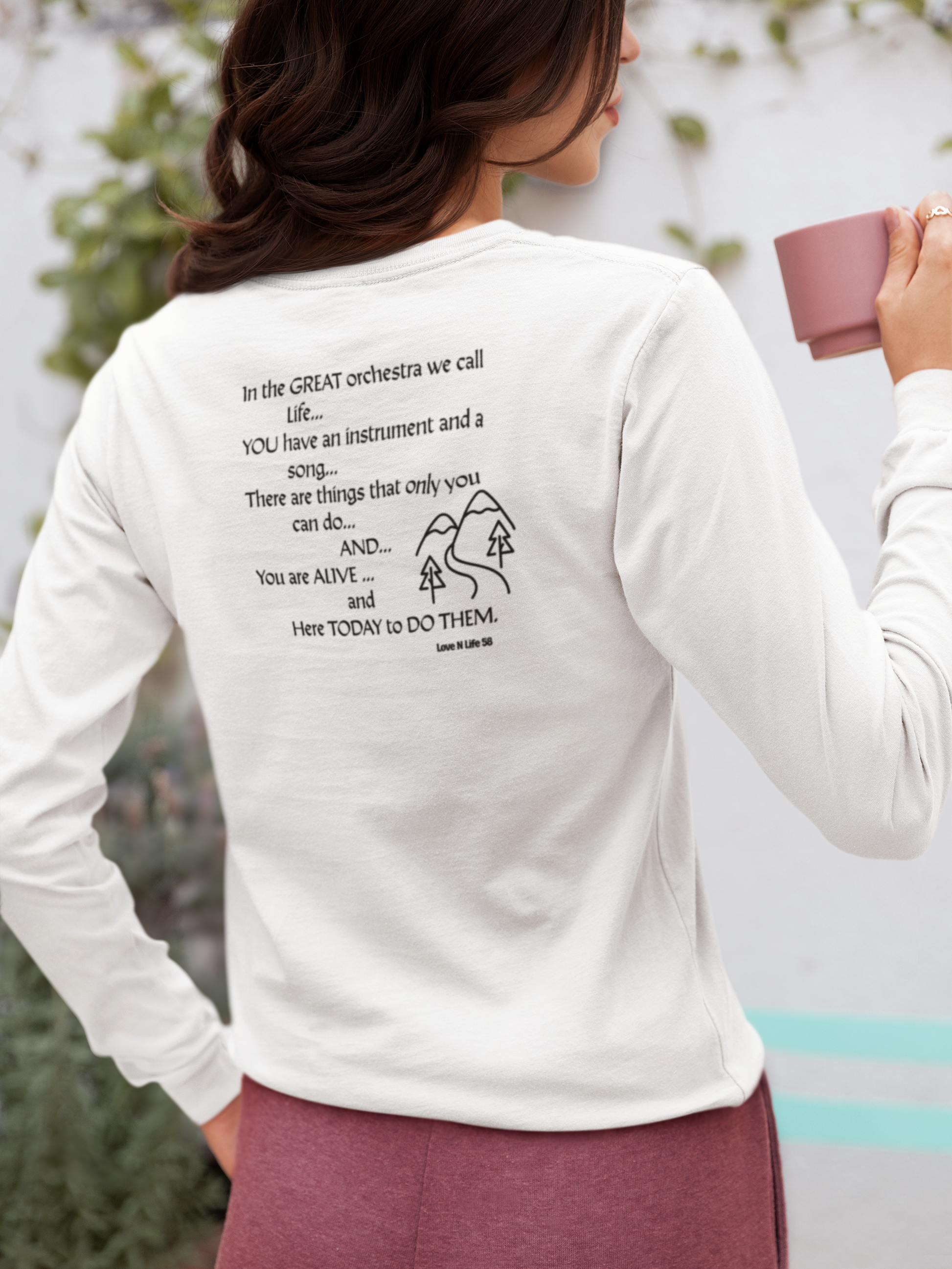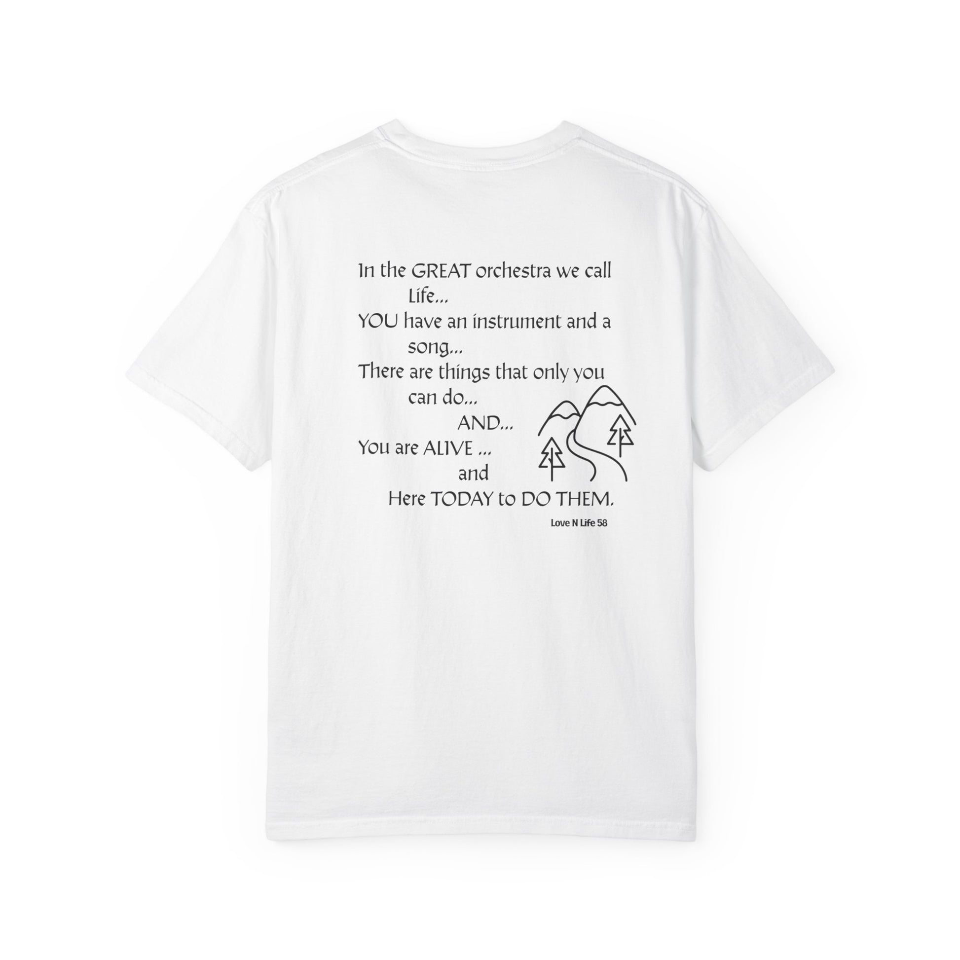 Description: Comfort Colors: This heavyweight garment-dyed tee feels lived-in from the first wear. The relaxed silhouette and tubular construction give a clean, boxy drape that sits casually over jeans or layered under a flannel. A simple, hand-drawn back print—a small hillside scene and a short, uplifting passage—turns the shirt into a quiet reminder to move through the day with intention. Soft, ring-spun cotton and the post-dye finish create a muted, vintage color and a supple hand you’ll reach for again and again. It’s the kind of everyday tee that becomes part of a routine: morning coffee, slow walks, and evenings around a small fire.