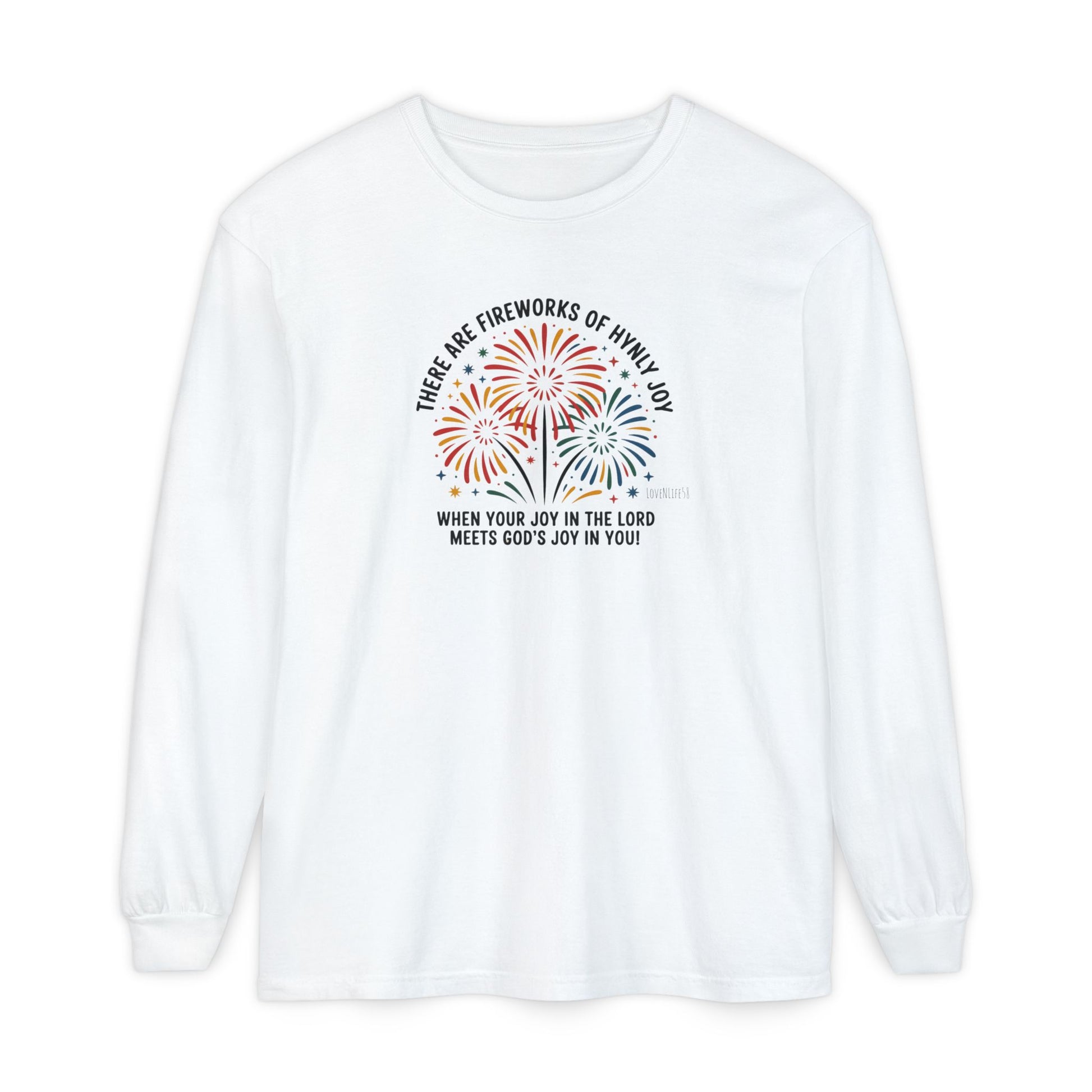 Comfort Colors - Preshrunk, lasting comfort. Celebrate joy and faith with this vibrant long sleeve t-shirt, perfect for conveying positive energy. The charming design, featuring colorful fireworks, brings a sense of wonder and excitement. Ideal for casual outings, gatherings with friends, or cozy evenings spent in reflection. This unisex garment is perfect for adults who appreciate stylish comfort and meaningful statements.