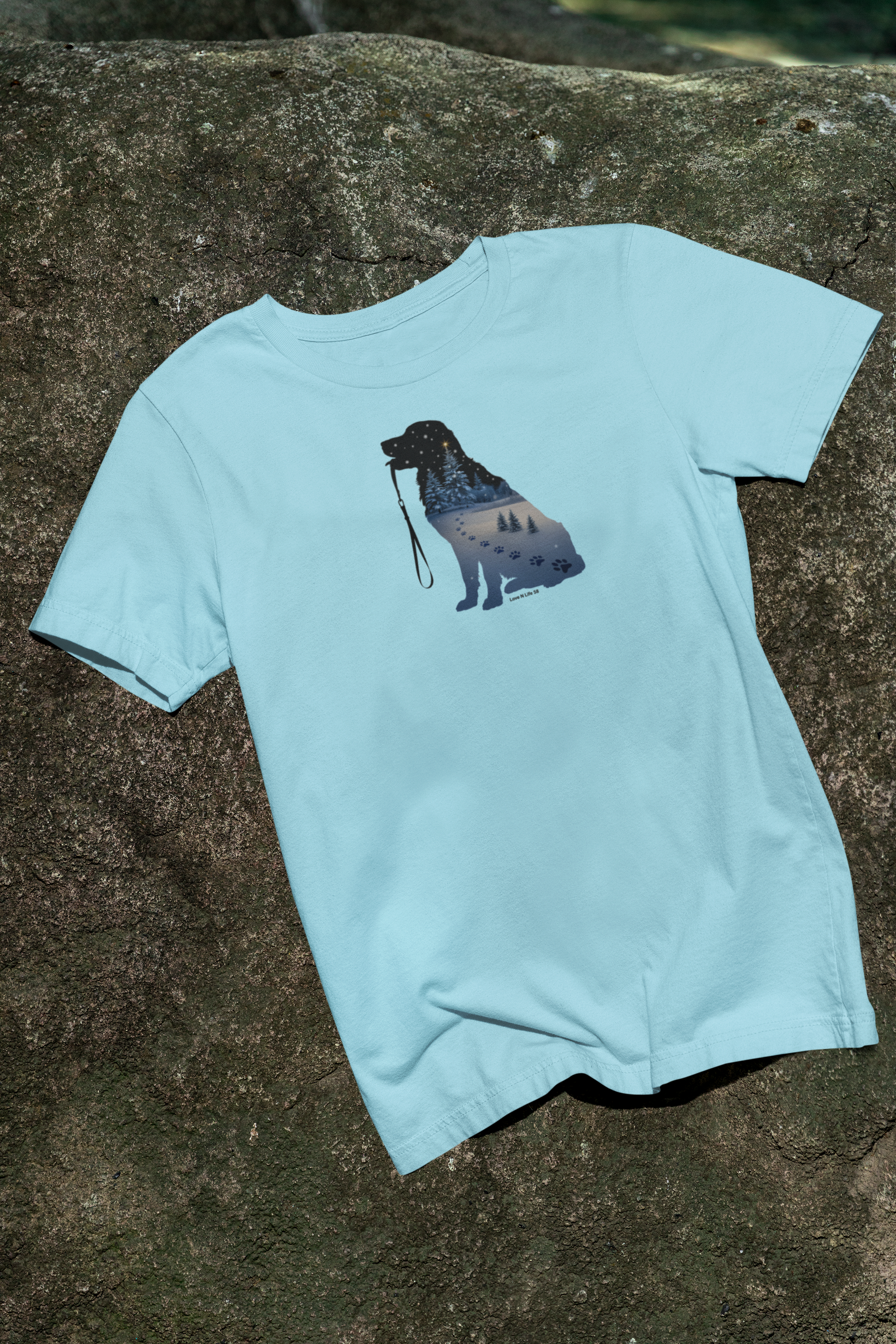 Desription: Comfort Colors - This relaxed-fit, garment-dyed tee combines rugged comfort with a quiet, outdoorsy spirit. A silhouette of a retriever holds a leash, and within the dog's shape a twilight landscape unfurls — pine trees, lake reflections, and a starlit sky rendered in soft, muted blues. The heavyweight, pre-shrunk cotton and double-needle seams give this shirt a lived-in durability that only improves with wear. It sits comfortably for long walks at dawn, campfire evenings, or cozy weekends by the lake, carrying a calm, nostalgic mood that reads like a small escape you can wear.